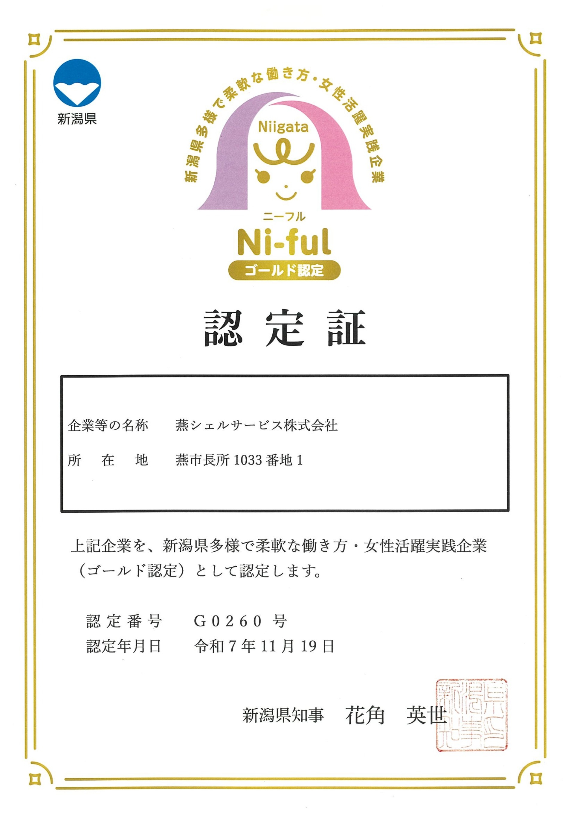 2025年12月11日(木) Ni-ful(ニーフル)認定企業 Ni-fulゴールド認定企業に認定されました ニーフルとは、県内で多様で柔軟な働き方や、女性の登用や育成などに積極的に取り組み、 その取組を支援することで企業における魅力ある職場環境づくり及び女性活躍を推進を目的とする制度です。 今後も社員全員が働きやすく、一人一人が活躍できる企業を目指してまいります。